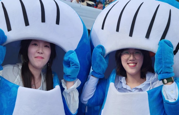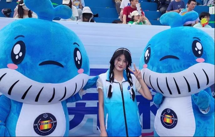 当然,在加油助威的人群中少不了我们经管学院的大明星——吉祥物鲸鲸。