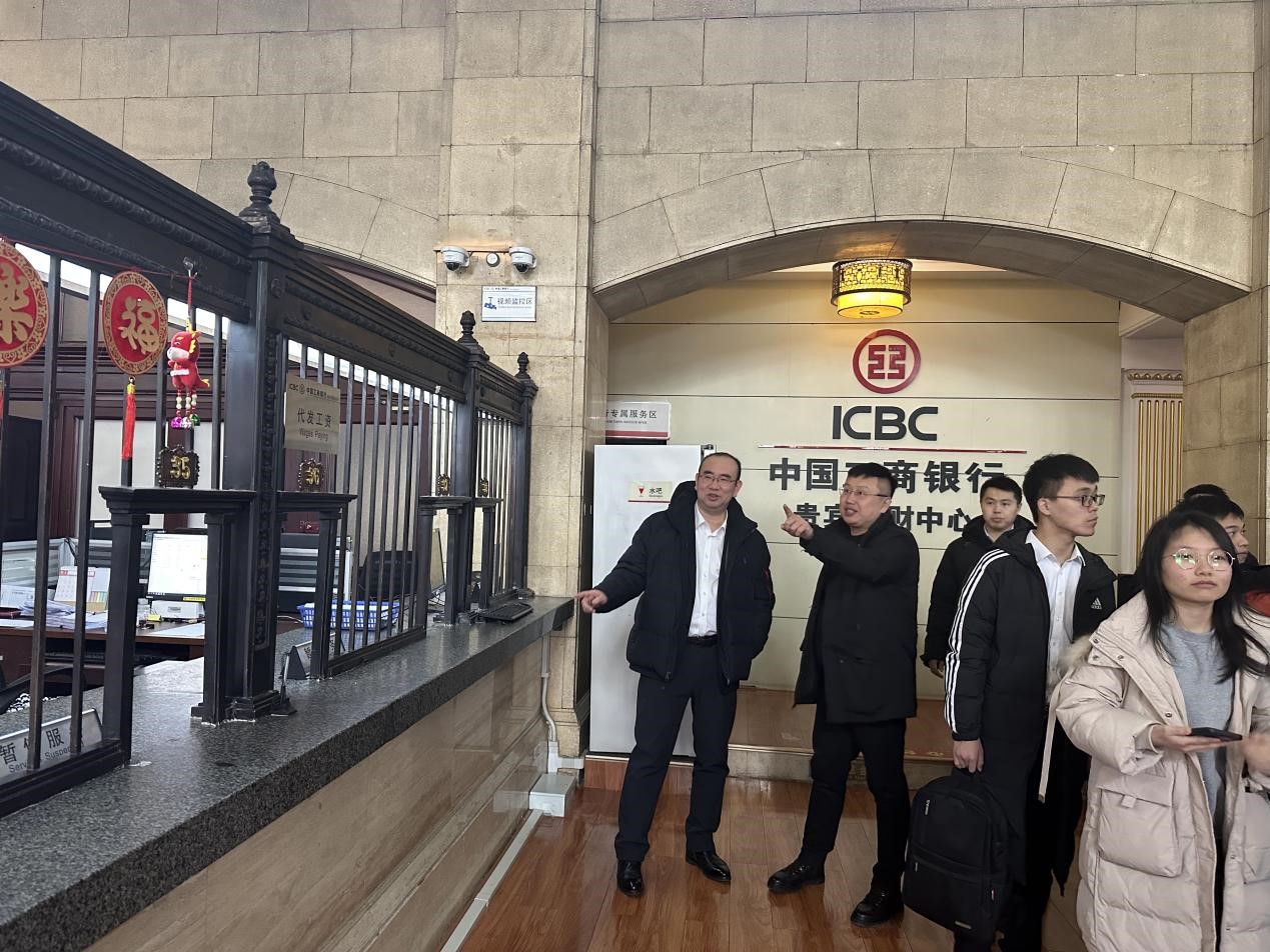 工商银行田地支行综合管理部副经理李沐风担任支行讲解员,先为同学们介绍了田地支行文化长廊,并对师生来访表示欢迎。随后,在营业室主任栾瑞佳的带领下同学们参观了银行的营业室大厅,详细了解了田地支行当前的窗口设置和业务组成等。