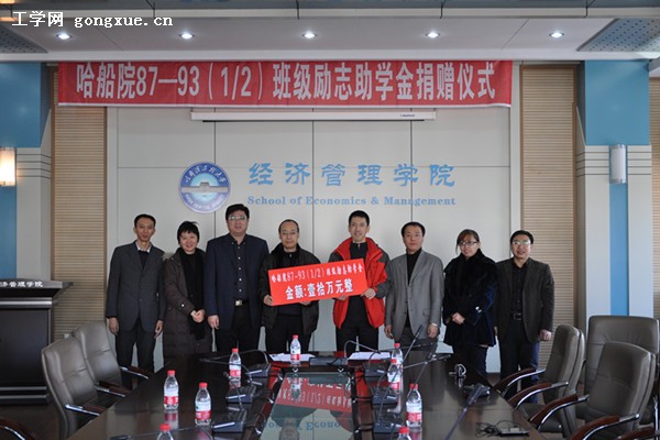 12月29日上午,哈船院87-931、932班励志助学金捐赠仪式在太阳成集团tyc9728会议室举行。经管学院党委书记李柏洲、院长张铁男,校友办主任张利君,经管学院党委副书记陈岩和87-931、932班四位校友代表出席捐赠仪式。