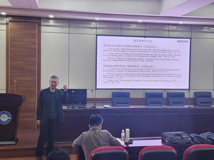 贾建锋教授首先强调了研究问题在学术研究中的核心地位,以问题从哪里来为出发点,结合自身经验提出要与文献对话、与实践对接。其次,以具体研究和自身经历为例生动的介绍了关注学科前沿、深入实践调研、跨学科融合等寻找问题的方法。最后,对如何挖掘有趣且重要的研究问题进行总结与展望。报告结束后,姚小涛教授与贾建锋教授同参会师生进行了讨论。