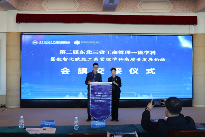 主旨报告结束后,举行会旗交接仪式,下届论坛由吉林大学商学与管理学院主办,吉林大学商学与管理学院副院长李雪灵教授接旗并致辞。