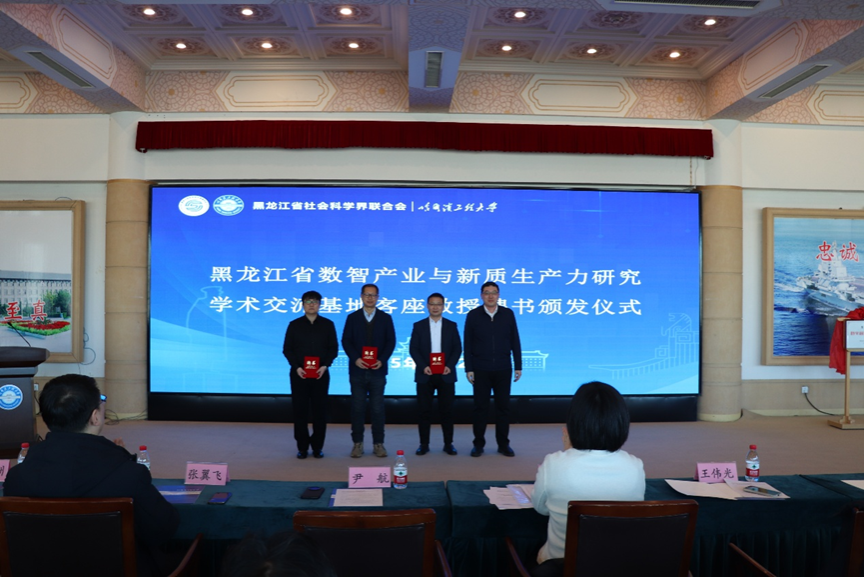 黑龙江省数智产业与新质生产力研究学术交流基地主任、校长助理尹航为基地客座教授颁发聘任证书。