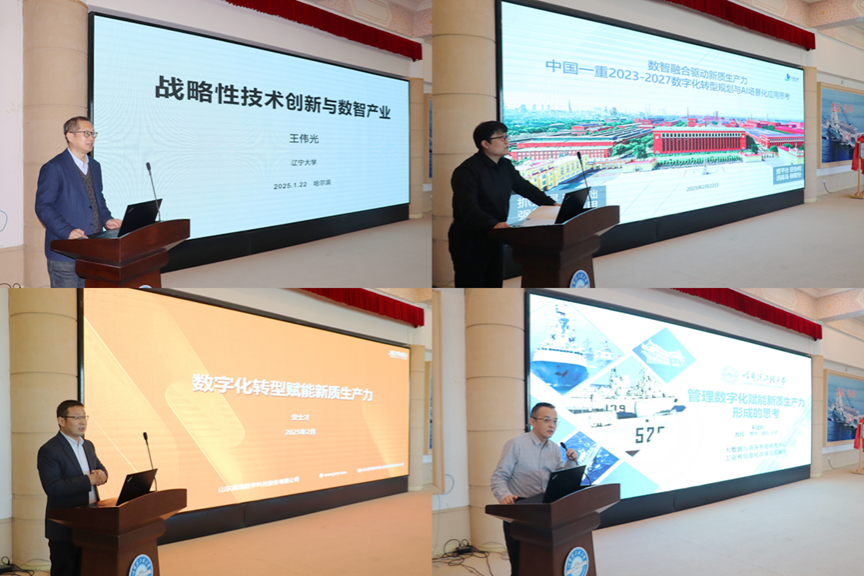 辽宁大学王伟光教授,中国一重信息中心高级经理、高级工程师张瑾,山东捷瑞数字科技股份有限公司副总裁安士才,太阳成集团tyc9728朱建新教授分别做了题为《战略性技术创新与数智产业发展》《数智融合驱动新质生产力:中国一重2023-2027数字化转型规划与AI场景化应用思考》《数字化转型赋能新质生产力》《管理数字化赋能新质生产力形成的思考》的专题报告。与会专家就数智产业与新质生产力发展进行深入研讨和交流,为数智产业与新质生产力研究学术交流基地发展建设贡献智慧和力量。
