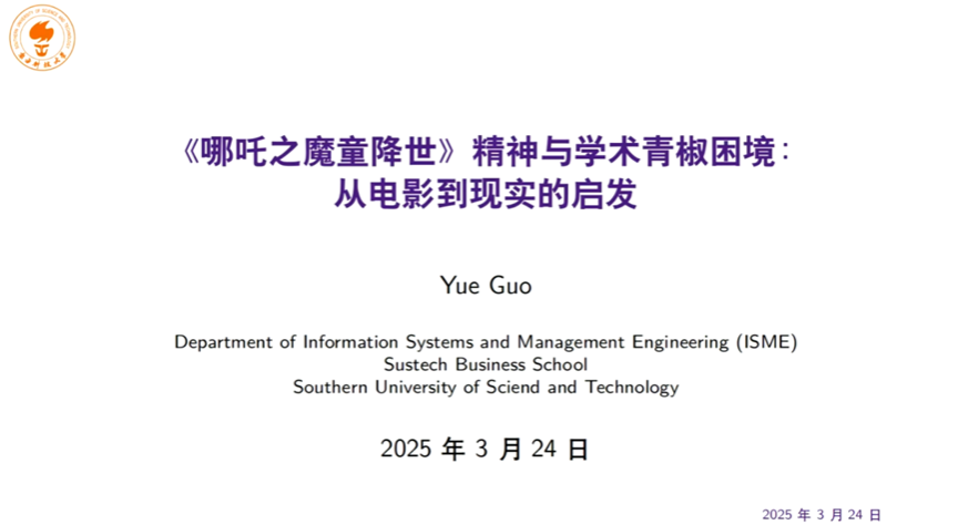 2025年3月24日,学院邀请南方科技大学商学院副教授(研究员)、博士生导师、DBA项目学术副主任郭悦老师,为师生在线上开展 “哪吒精神与青椒科研困境:从电影、诗词到现实启发”专题讲座,讲座由大数据与商务智能技术工业和信息化部重点实验室副主任曾能民副教授主持。