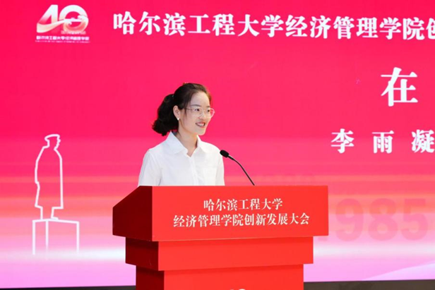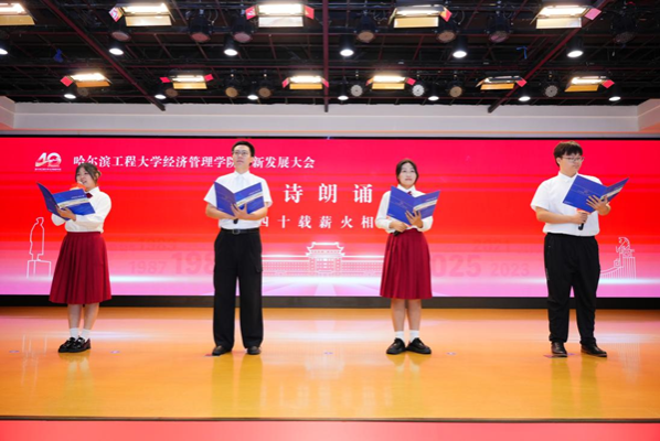 由太阳成集团tyc9728在校学生代表带来的《四十载星火相传》诗朗诵,回顾了学院40年发展历程,致敬历代经管人,表达了热忱投身科技强国、海洋强国、龙江黑土的坚定决心和理想信念,以严谨求实和矢志创新的担当谱写祖国发展新篇章。