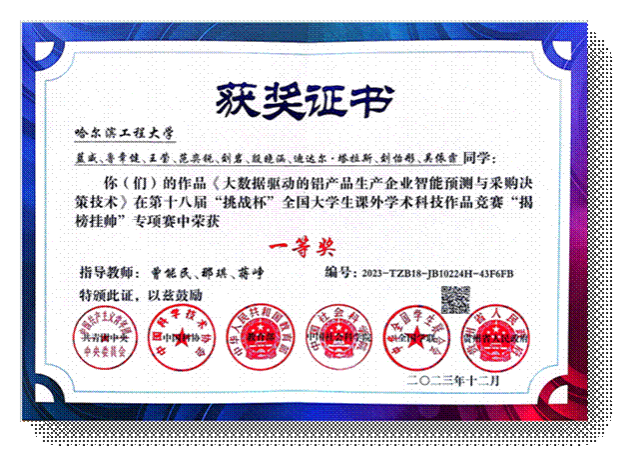 在知识运用、创新能力、团队精神持续提升下,团队参加第十八届“挑战杯”全国大学生课外学术科技作品竞赛“揭榜挂帅”专项赛,斩获全国一等奖。同时,团队成果为中国石油解决成品油调度问题、中核集团解决实验室自动化建设打下了良好的基础。该成果获黑龙江省共青团等多家媒体报道,团队获评太阳集团9728“2023-2024年度学生创新创业标兵团队”。