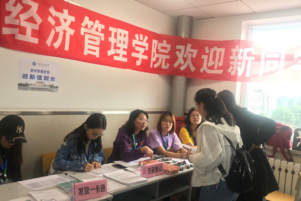 迎新工作人员首先布置好迎新现场,七点半正式开始迎接新生。迎新工作分工明确,一部分工作人员于公寓门口接站,引导新生通过电梯进入自己寝室所在楼层;另一部分在报道处等候新生的到来,负责登记信息,并发放新生一卡通、体检单等所需物品,新生领取自己所需物品后,由专门的新生导航员帮助新生办理后续的入学手续以及帮助新生了解学校,解答新生以及家长的一些疑问。23日的迎新工作于晚上10时结束,工作人员整理好各项材料,为后续的迎新工作做好充分的准备。
