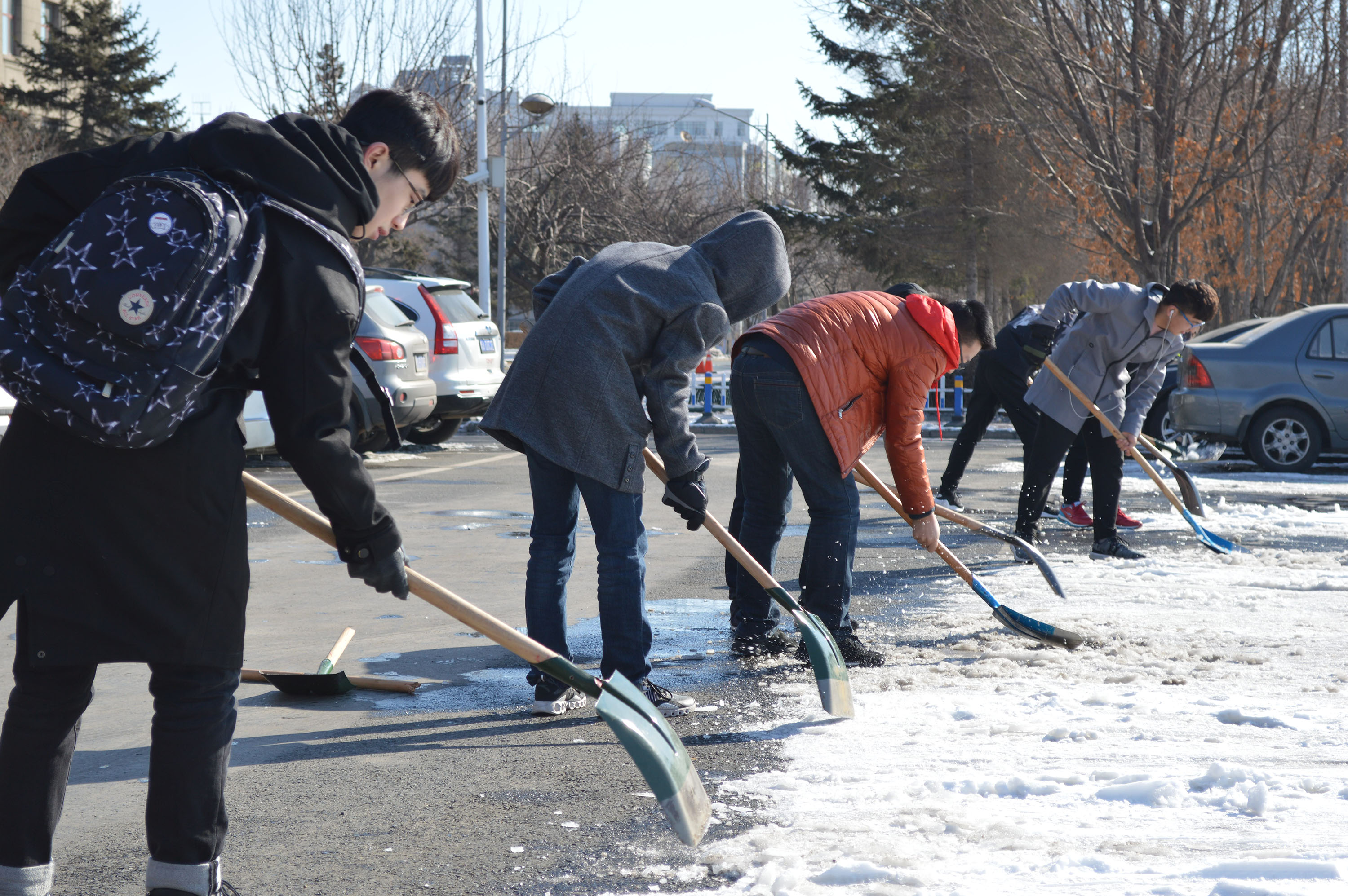 活动开始前,王恒带领大家取工具,把成员分成几个小组,为各小组大致划分区域。初期,活动进展的并不顺利,天气寒冷,冰雪坚硬,清雪进度十分缓慢。王恒与几位同学进行商议,找到了一些小技巧,“冰雪硬,同学们的心更坚”,所有人齐心协力,毫不松懈,进度明显加快。直至11时30分,任务如期完成。最后,全体参与人员合影留念,活动结束。