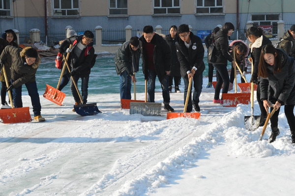 到达燎原小学后,于天一部长对劳动任务进行了部署,志愿者们便开始了紧张而有序的扫雪任务。志愿者们被分为两大组,由部长于天一和副部乔琦峰带领,大家又各自结伴,一人铲雪,数人推雪。志愿者们认真打扫,效率极高。由于准备充分,志愿者们将小学操场上的冰和雪都清理干净,活动进行的十分顺利。