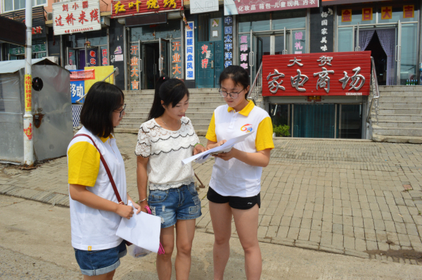 为使调研活动能够快速全面地展开,“三下乡”志愿者服务队伍18人分成4个小组,明确各组责任街区。队员到达各自地点后,自行选择商店开展调研,根据不同的情况,迅速制定相应的方案并展开。
