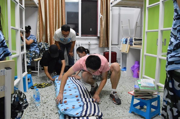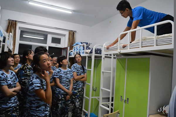 首先把三个宿舍的人集中到一处,集中讲解叠被规则,说明了内务整理标准,强调内务整理的关键是看床褥,“三分折七分修”,边讲解边示范,就折叠的尺寸、虚部掏平、压平、两次对折等手法一一讲解,反复把被子的棱角弄正后,出现了一个豆腐块似的棱角分明的被子时,现场爆发出同学们的惊叹声和掌声。然后新生各自回宿舍,开始尝试正规地叠被子。新生导航员到每个寝室依次做指导,实在有问题的再做示范,直到所有新生都能独自完成叠被。