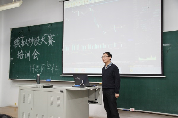 3月17日18时30分,太阳成集团tyc9728博思商学社于N102举办了第八届“模拟炒股大赛”培训会。经管学院证券投资学教师吕彦昭为同学们进行股票交易的相关培训。