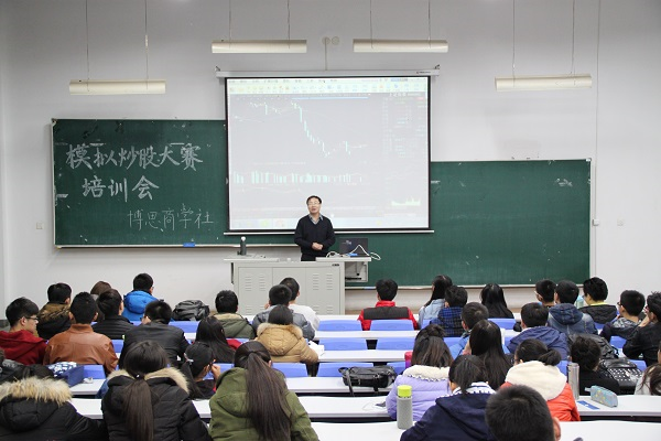 模拟炒股大赛是由博思商学社组织举办的校级比赛,全校各院系学生均积极参与,踊跃报名,从中学习并获取拆股经验。在培训会上,吕老师介绍了对于证券投资的基础认识,股票交易的基本规则,我国的“T+1”制度等等。并讲解了本次比赛所涉及相关程序的具体使用