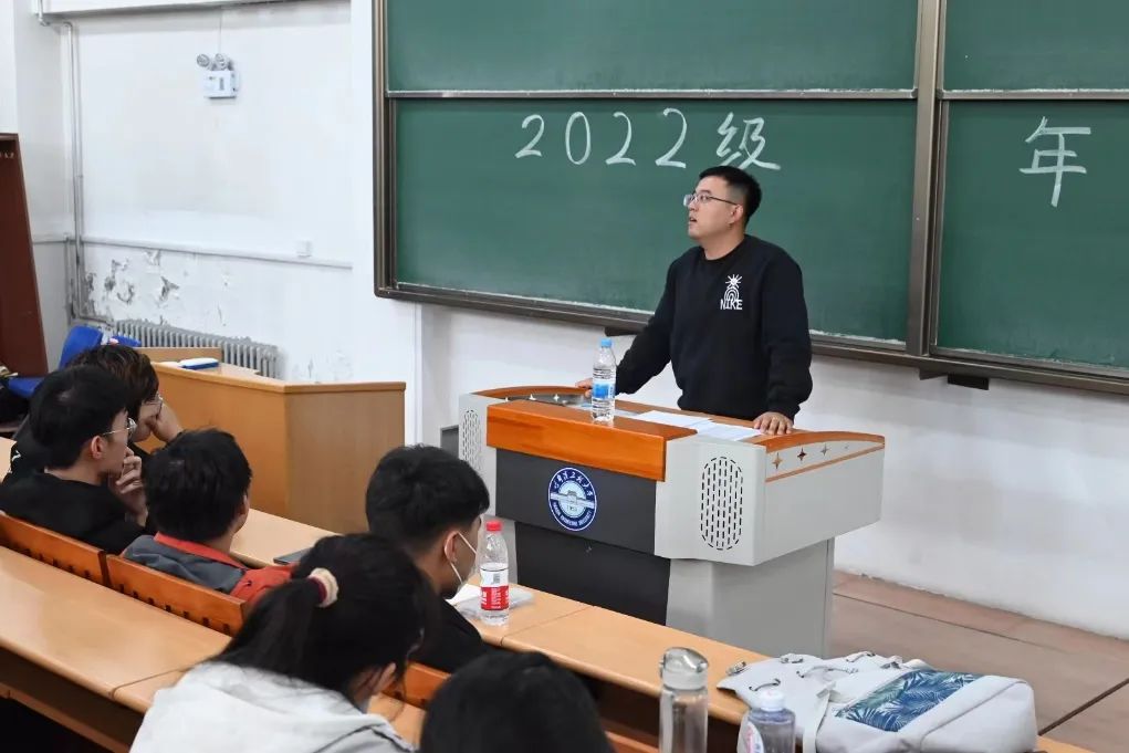 本次大会由2022级本科生辅导员张胜强主持。张胜强辅导员在开场时点名后,分享了一个实用的工作小技巧——任何会议带本记笔记,工作更高效。会议开始,张胜强导员提出了一个具有创意性的建议,鼓励每位同学“凝练自己的标签”。他指出,“初入大学的新生们,人和人都是相似的,这导致人与人相处的时候缺乏记忆点,而一个没有记忆点的大学生,要脱颖而出是困难的,所以我们现在要做的是‘挑起摸高’。张胜强导员激情讲到:只有同学们找到自己的长处,做好自我规划,把握机会,发挥优势,不断沉淀,才能跳出井底,拥抱更多彩的大学生活。