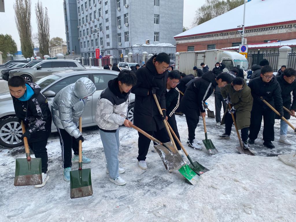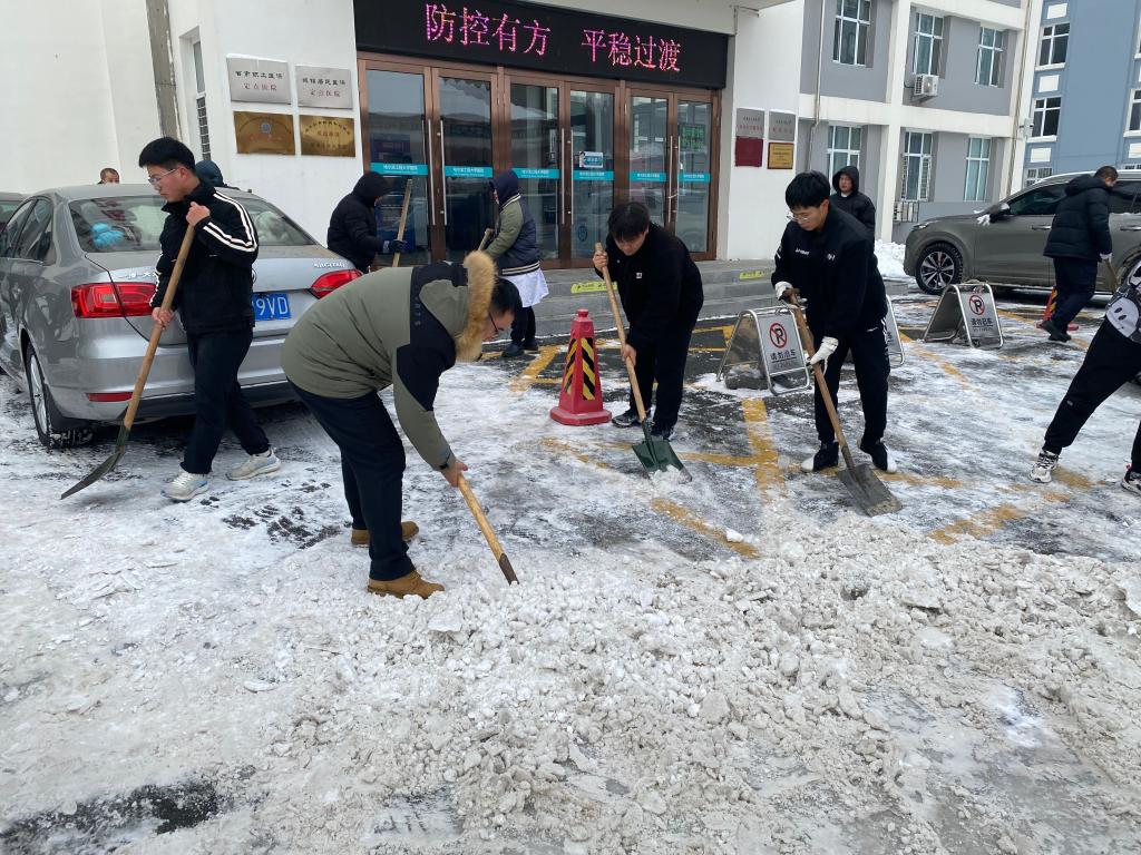 大家不畏严寒,齐心协力,铲的铲、推的推、扫的扫,干得热火朝天,经过一中午的辛勤劳动,路面的积雪被清扫,为师生的就医出行消除了隐患、提供了便利。
