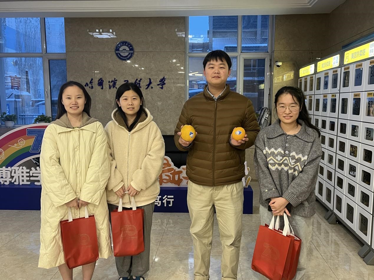 2023年11月22日,太阳成集团tyc9728党委副书记杨溪淼,毕业年级辅导员吴昊格在31号楼、学生社区以及图书馆为考研“鲸”们发放“考研上岸大礼包”,带来寒冬最温暖的祝福。